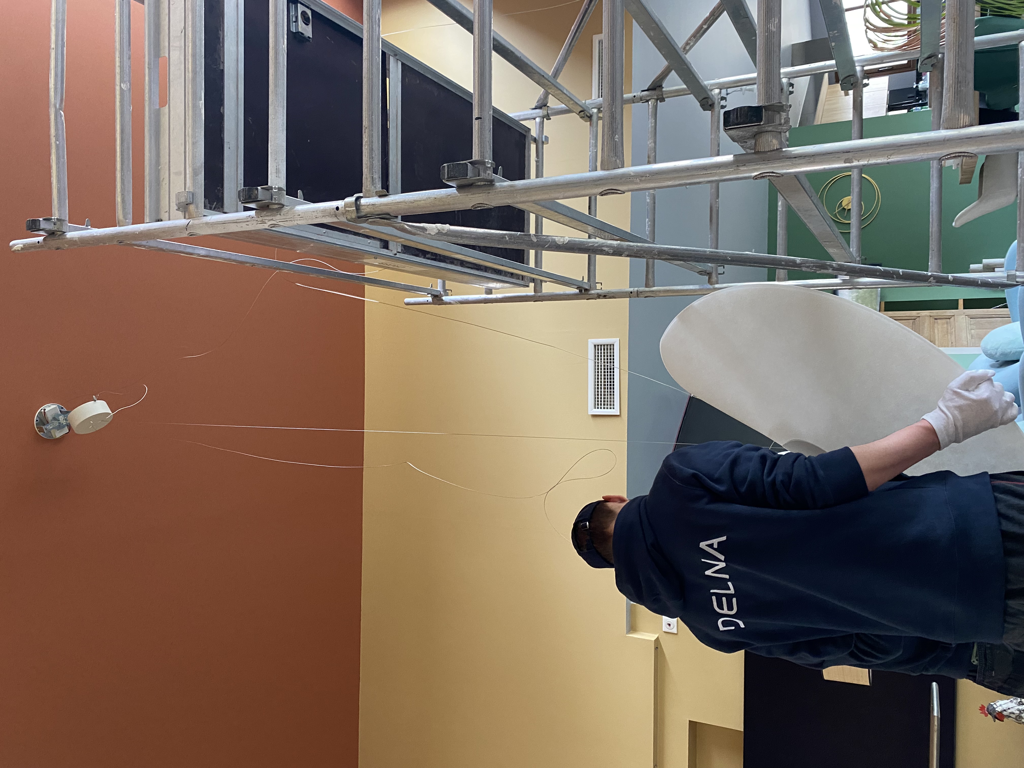 La difficulté principale sur ce type d'installation ? La hauteur sous plafond. Les pièces concernées affichaient des plafonds à plus de 3,50 mètres, ce qui rend la pose depuis une échelle simple impossible. Nous avons travaillé depuis un échafaudage roulant, seule solution pour travailler en sécurité, avec les deux mains libres, et placer le luminaire avec la précision nécessaire.